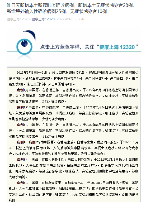 荔枝新闻讯 据“健康上海12320”微信号消息,2022年3月5日0—24时,通过口岸联防联控机制,上海报告25例新增境外输入性新冠肺炎确诊病例。新增治愈出院8例,其中来自乌克兰2例,来自阿联酋2例,来自泰国1例,来自新加坡1例,来自美国1例,来自中国香港1例。