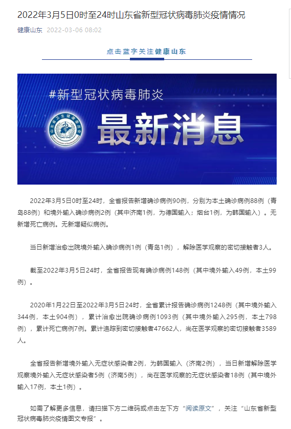 截至2022年3月5日24时,山东省报告现有确诊病例148例(其中境外输入49例,本土99例)。