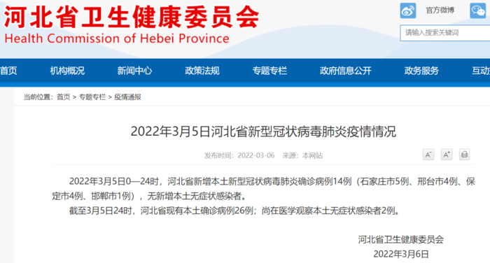 荔枝新闻讯 据河北省卫健委网站消息,2022年3月5日0—24时,河北省新增本土新型冠状病毒肺炎确诊病例14例(石家庄市5例、邢台市4例、保定市4例、邯郸市1例),无新增本土无症状感染者。