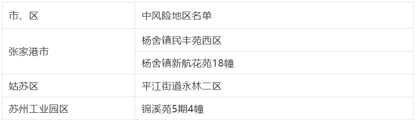 张家港市杨舍镇新农花苑25幢、吴江区八坼街道邮电街23号2幢、吴江区长安路2358号吴江科技创业园、吴中区郭巷街道塘北社区124号、苏州工业园区京隆生活区、苏州工业园区凤凰城49幢由中风险地区调整为低风险地区。