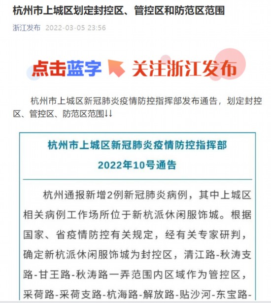 当晚,根据疫情防控需要和感染风险,该市滨江区、上城区已落实“三区”管控机制,以限制人员流动、阻断病毒传播、确保管控到位为目标,划定和动态调整封控区、管控区、防范区最小管控区域。