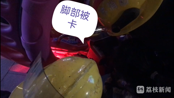 接到女子报警后,镇江新区丁卯消防救援专职队的5名消防人员火速赶往了现场,在广场一处游乐场所设施旁,这名女子正在大声哭泣、呼救,她小腿部位被卡在电动玩具仓鼠车座位的缝隙内。“您不要乱动,我们正在想办法,很快就会好的。”前来救援的消防队员唐政一边安抚女子的情绪,一边仔细观察女子腿部被卡的部位,他发现电动玩具车座位夹缝间还留有一定空间,随即利用液压扩张器扩大座位的空隙,其他几位消防队员合力将女子抬起,并将其小腿从座位夹缝间抽出。女子委屈的向消防队员解释:“是我自己脚底下没有注意,踩空后才发现被卡住,怎么‘自拔’脚都抽不出来。”