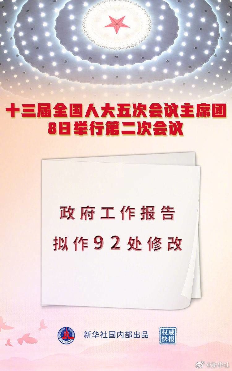记者8日从十三届全国人大五次会议主席团第二次会议上获悉,政府工作报告拟作92处修改。
