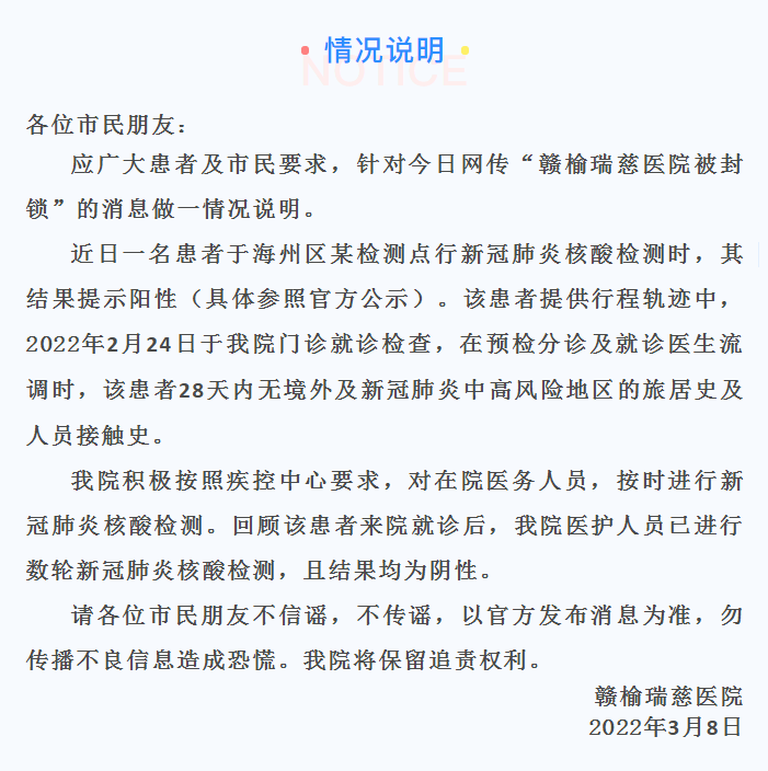 荔枝新闻讯 据“赣榆瑞慈医院“微信公号消息,赣榆瑞慈医院应广大患者及市民要求,针对网传“赣榆瑞慈医院被封锁”的消息做情况说明。全文如下: