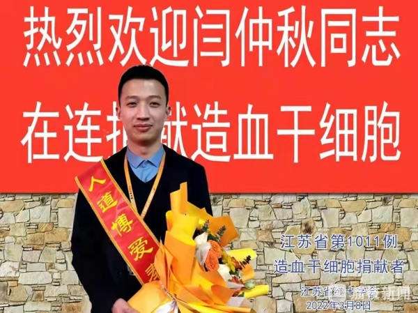 闫仲秋的老家在连云港市赣榆区海头镇,在中国船舶集团第七一六研究所工作。2014年读大二开始,他一直坚持参加无偿献血。在献血过程中,他偶然得知造血干细胞可以为血液病患者送去生的希望,当即留下血液样本,主动申请加入中华骨髓库,成为一名光荣的造血干细胞捐献志愿者。