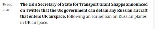 据英国《卫报》报道,英国交通大臣格兰特·沙普斯当地时间8日发推文称,“我已将任何俄罗斯飞机进入英国领空定为刑事犯罪”,现在英国政府可扣留这些飞机。