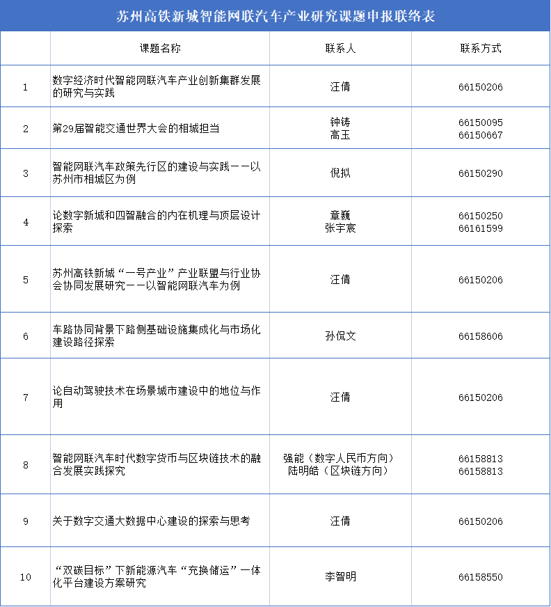 诚邀智能网联汽车优秀企业、团队,共话智能网联汽车发展新未来。如有意参加课题研究,请拨打相关课题联系方式。打造智能网联汽车产业创新集群,期待你们的加入。(相城区融媒体中心 李媛媛 通讯员 张珊珊)