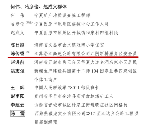 近日第十四届全国见义勇为英雄模范名单新鲜出炉,其中江苏沿江高速公路有限公司江阴新桥服务区安全员陈传香成功入选全国见义勇为模范。