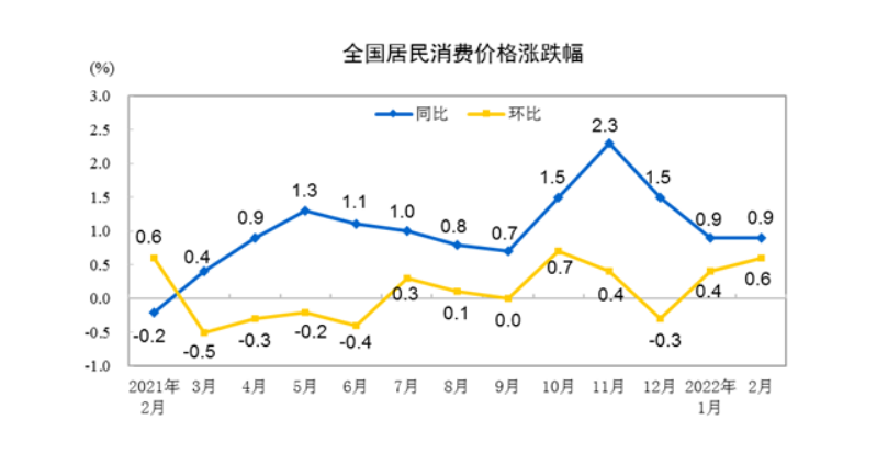 国家统计局9日发布数据显示,2月份,全国居民消费价格指数(CPI)同比上涨0.9%,涨幅与上月相同,国内物价总水平继续保持平稳运行。