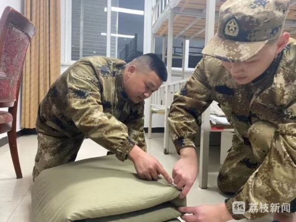 今天,记者走进常熟市国防园役前教育训练基地的宿舍,两名准新兵正在围着一床军被忙前忙后。“小欢,军被每折一下,都要用右手指尖在折口处用力划,这样才能确保成‘豆腐块’。”其中,一名身材魁梧的青年细心地指导着旁边的战友,举手投足间散发出与众不同的军人气。