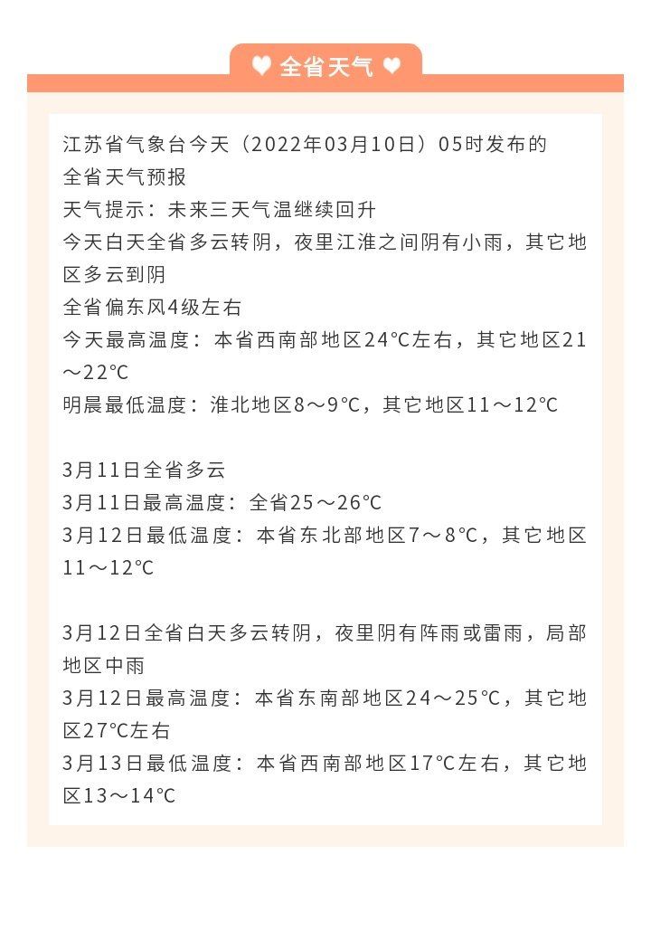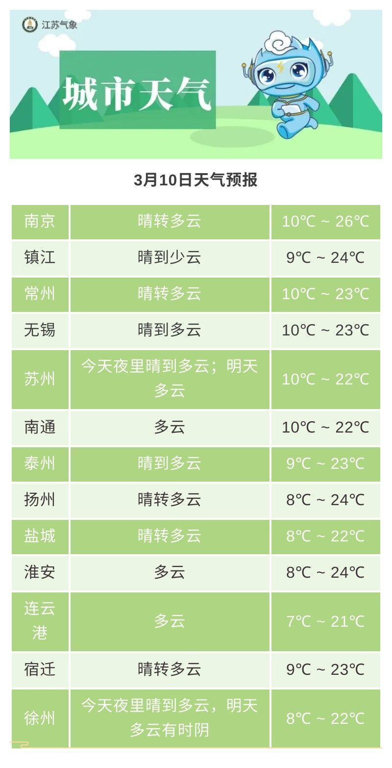 目前江苏南京、常州、镇江、苏州已经官宣入春!而据江苏省气象台,今天(10日)白天全省多云转阴,夜里江淮之间阴有小雨,其它地区多云到阴,全省偏东风4级左右,今天最高温度:本省西南部地区24℃左右,其它地区21~22℃,明晨最低温度:淮北地区8~9℃,其它地区11~12℃。