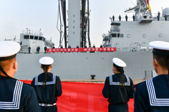 中国海军第39批护航编队由导弹驱逐舰乌鲁木齐舰、导弹护卫舰烟台舰和综合补给舰太湖舰组成,2021年9月26日从山东青岛某军港起航。执行任务以来,编队严格落实疫情防控措施,严密组织护航行动,采取延伸护航、接力护航等多种方式确保被护船舶航行安全,有力维护了国际海上贸易通道安全和地区和平稳定。