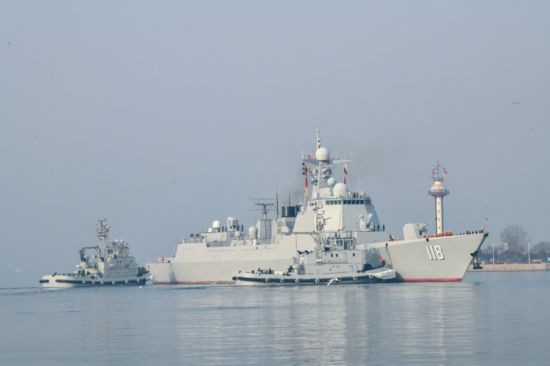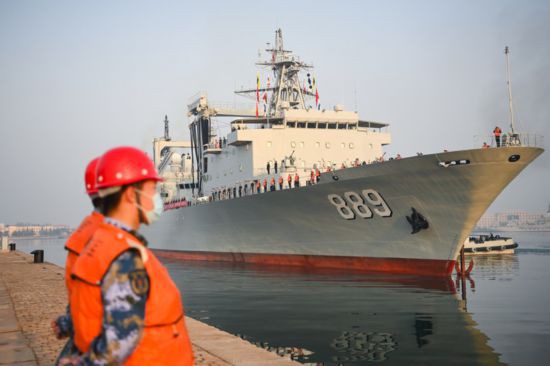 3月9日,中国海军第39批护航编队圆满完成亚丁湾、索马里海域护航任务,返回山东青岛某军港。新华社发(徐涛涛 摄)