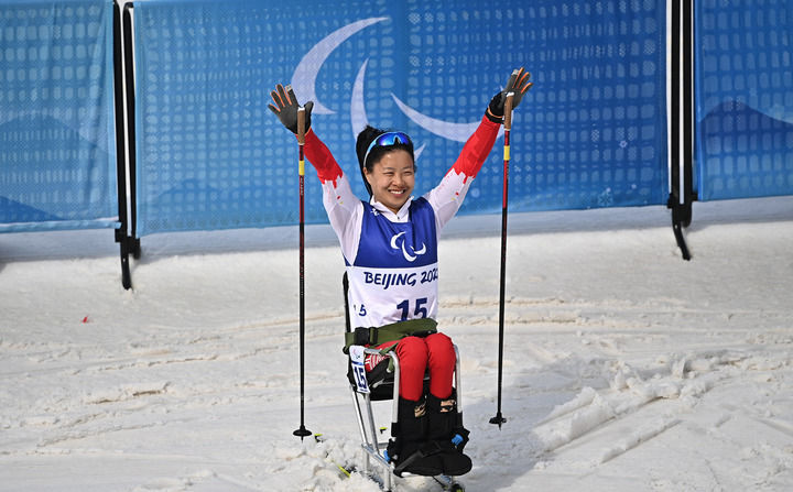 3月9日,冠军中国选手杨洪琼在北京冬残奥会残奥越野滑雪女子短距离(坐姿)决赛后庆祝。新华社记者侯昭康摄