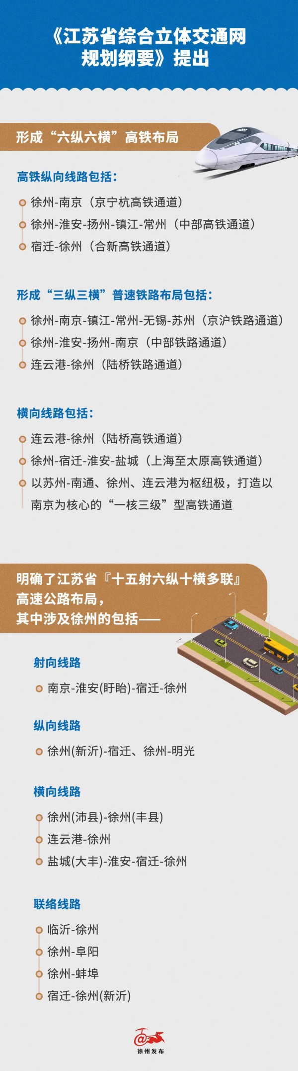 为达到上述目标,《纲要》从完善开放畅达的综合运输通道、建成“轨道上的江苏”、打造城市群城际和都市圈市域(郊)铁路、完善广覆深达的公路交通网等若干方面,规划建设高效互联的综合立体交通网络,徐州在各方面均居于重要节点位置。
