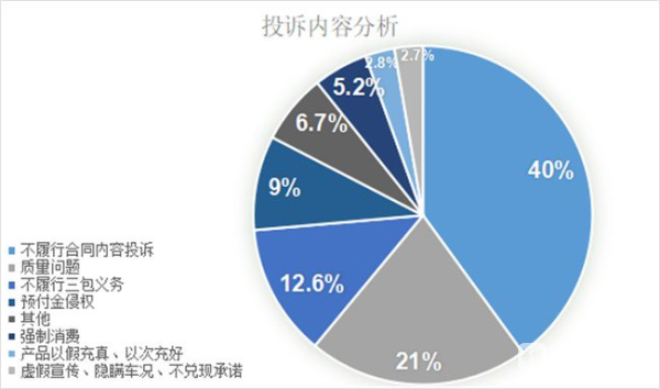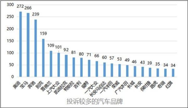 2021年受理汽车类消费投诉中,不履行合同内容占投诉总量40%;质量问题占21%;不履行三包义务占12.6%。投诉品牌中,奥迪、宝马、奔驰投诉分列投诉总量前三名,远超其他品牌,投诉量前三名的合资品牌中,除别克投诉量较上一年度降低了13%外,雪佛兰、上汽大众分别增长了40%和48%,增幅很大。南京市消费者协会汽车专委会副主任秦有跃说,销量增加可能占一部分因素,但是我觉得更多反映,厂家的质量包括服务方面有问题,不履行合同约定排投诉第一,质量投诉排第二。