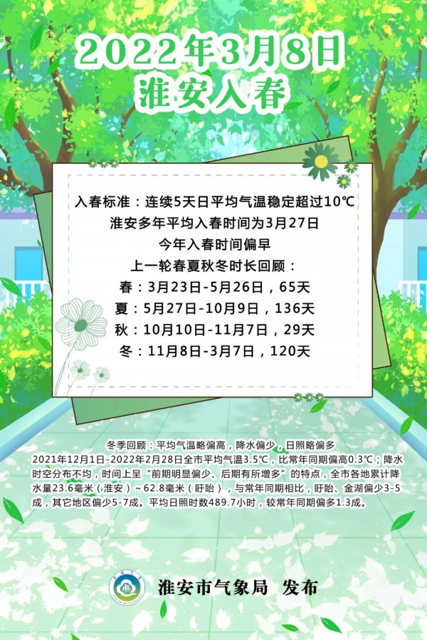 眼下淮安处处春光明媚,柳树抽出了嫩嫩的绿芽,玉兰花开始展露芳颜。市气象台宣布淮安从3月8日开始进入到气象学意义上的春天。按照常年我市3月下旬的入春时间,今年的春天来得着实有点早。