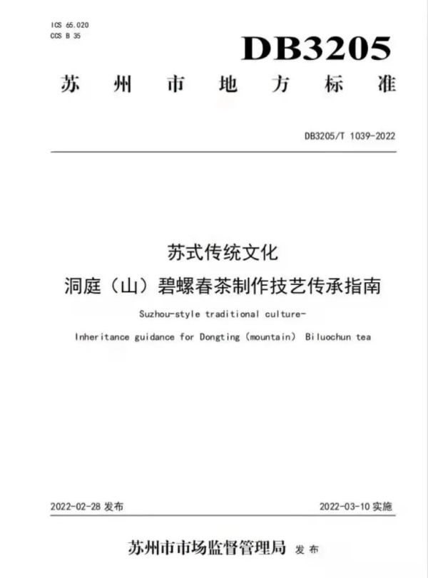 日前,经苏州市市场监督管理局批准,苏州市地方标准(DB3205/1039-2022)《苏式传统文化 洞庭(山)碧螺春茶制作技艺传承指南》正式发布,于今天正式实施!