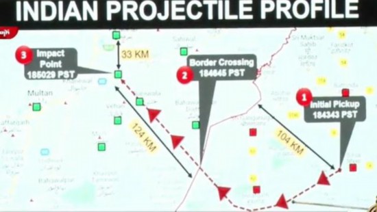 巴基斯坦军方公布的印度“高速飞行物”飞行路径
