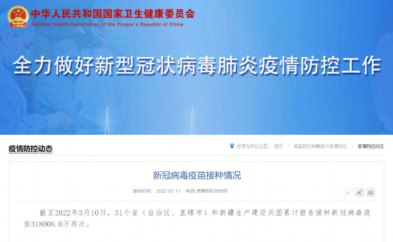 截至2022年3月10日,31个省(自治区、直辖市)和新疆生产建设兵团累计报告接种新冠病毒疫苗318006.0万剂次。