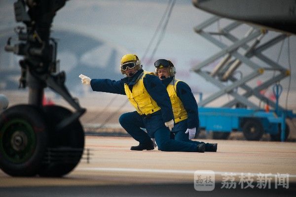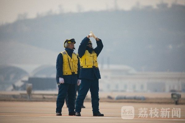 战机进入预定位置后,身着“黄色马甲”的起飞助理给出手势,示意起飞站内的操作员升起偏流板装置和止动轮挡。