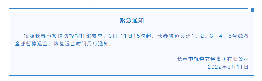 荔枝新闻讯 据长春市轨道交通集团有限公司消息,按照长春市疫情防控指挥部要求,3月11日15时起,长春轨道交通1、2、3、4、8号线将全部暂停运营,恢复运营时间另行通知。