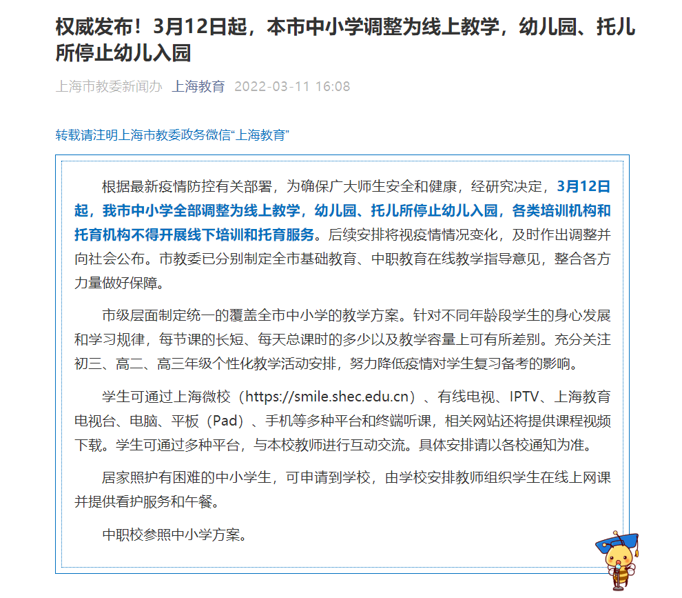 荔枝新闻讯 据上海教育微信公号消息,根据最新疫情防控有关部署,为确保广大师生安全和健康,经研究决定,3月12日起,我市中小学全部调整为线上教学,幼儿园、托儿所停止幼儿入园,各类培训机构和托育机构不得开展线下培训和托育服务。后续安排将视疫情情况变化,及时作出调整并向社会公布。市教委已分别制定全市基础教育、中职教育在线教学指导意见,整合各方力量做好保障。