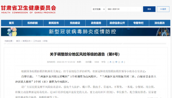 自即日起,“兰州新区秦川镇五道岘村”1个村调整为高风险区,“兰州新区秦川镇振兴村三社、白银市景泰县上沙沃镇大桥村”2个村(社)调整为中风险区。