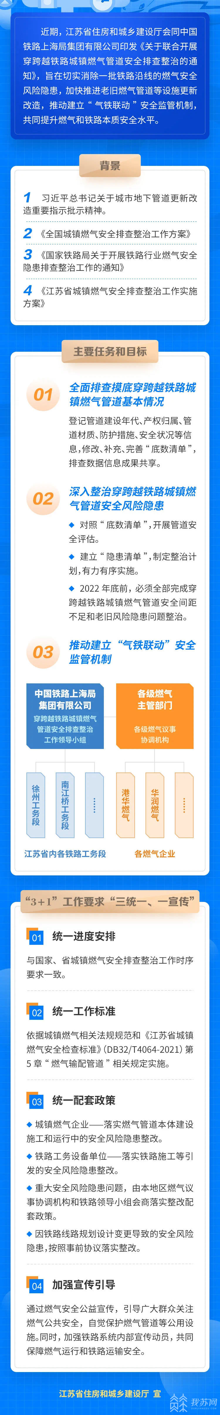 记者近期从江苏省住建厅了解到,省住建厅会同中国铁路上海铁路局印发《关于联合开展穿跨越铁路城镇燃气管道安全排查整治的通知》,切实消除一批铁路沿线的燃气安全风险隐患,加快推进老旧燃气管道设施更新改造,推动建立“气铁联动”安全监管机制,共同提升燃气和铁路本质安全水平。