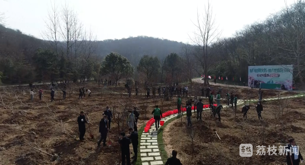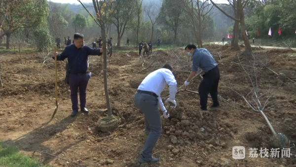 在镇江市南山绿道旁,一百多名党员干部群众栽下一棵棵树苗,植树现场一片繁忙的劳动景象,党员干部和志愿者们三五一组,有的挥锹铲土、有的扶苗填土、有的踩实浇水,大家尽情挥洒汗水。500棵樱花树苗迅速挺立在南山绿道边。