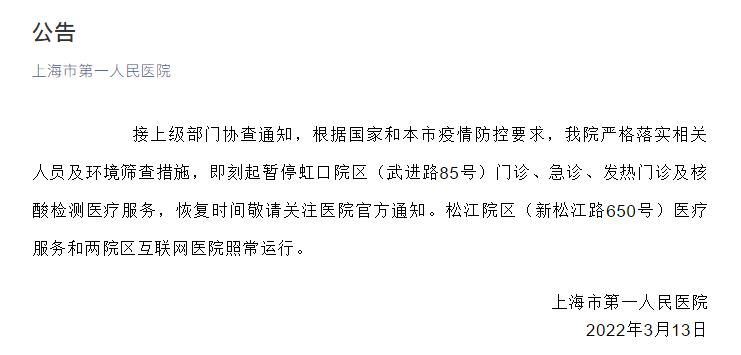 荔枝新闻讯 3月13日,“上海市第一人民医院”微信公众号发布公告:接上级部门协查通知,根据国家和本市疫情防控要求,我院严格落实相关人员及环境筛查措施,即刻起暂停虹口院区(武进路85号)门诊、急诊、发热门诊及核酸检测医疗服务,恢复时间敬请关注医院官方通知。松江院区(新松江路650号)医疗服务和两院区互联网医院照常运行。