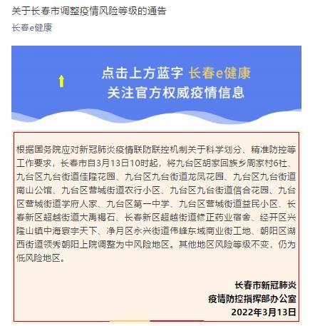 荔枝新闻讯 据“长春e健康”微信公众号消息,长春市新冠肺炎疫情防控指挥部办公室发布关于长春市调整疫情风险等级的通告:根据国务院应对新冠肺炎疫情联防联控机制关于科学划分、精准防控等工作要求,长春市自3月13日10时起,将九台区胡家回族乡周家村6社、九台区九台街道佳隆花园、九台区九台街道龙凤花园、九台区九台街道南山公馆、九台区营城街道农行小区、九台区九台街道信合花园、九台区营城街道学府人家、九台区第一中学、九台区营城街道益民小区、长春新区超越街道大禹褐石、长春新区超越街道修正药业宿舍、经开区兴隆山镇中海寰宇天下、净月区永兴街道伟峰东域商业街工地、朝阳区湖西街道领秀朝阳上院调整为中风险地区。其他地区风险等级不变,仍为低风险地区。