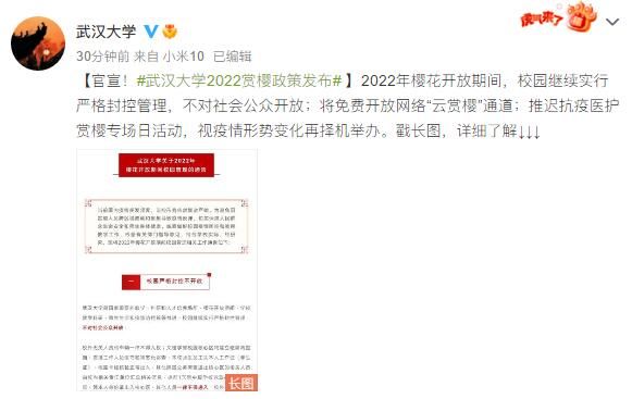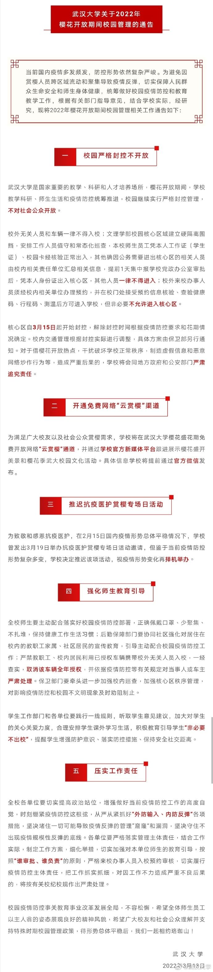2022年樱花开放期间,校园继续实行严格封控管理,不对社会公众开放;将免费开放网络“云赏樱”通道;推迟抗疫医护赏樱专场日活动,视疫情形势变化再择机举办。详细了解↓↓↓