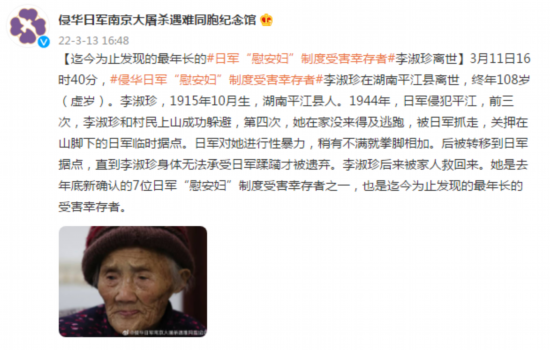 荔枝新闻讯 根据侵华日军南京大屠杀遇难同胞纪念馆微博消息,3月11日16时40分,侵华日军“慰安妇”制度受害幸存者李淑珍在湖南平江县离世,终年108岁(虚岁)。李淑珍,1915年10月生,湖南平江县人。1944年,日军侵犯平江,前三次,李淑珍和村民上山成功躲避,第四次,她在家没来得及逃跑,被日军抓走,关押在山脚下的日军临时据点。日军对她进行性暴力,稍有不满就拳脚相加。后被转移到日军据点,直到李淑珍身体无法承受日军蹂躏才被遗弃。李淑珍后来被家人救回来。她是去年底新确认的7位日军“慰安妇”制度受害幸存者之一,也是迄今为止发现的最年长的受害幸存者。
