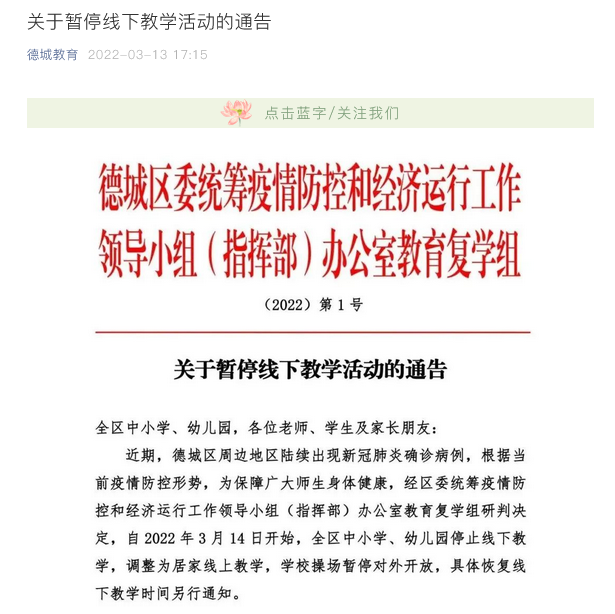 近期,德城区周边地区陆续出现新冠肺炎确诊病例,根据当前疫情防控形势,为保障广大师生身体健康,经区委统筹疫情防控和经济运行工作领导小组(指挥部)办公室教育复学组研判决定,自2022年3月14日开始,全区中小学、幼儿园停止线下教学,调整为居家线上教学,学校操场暂停对外开放,具体恢复线下教学时间另行通知。