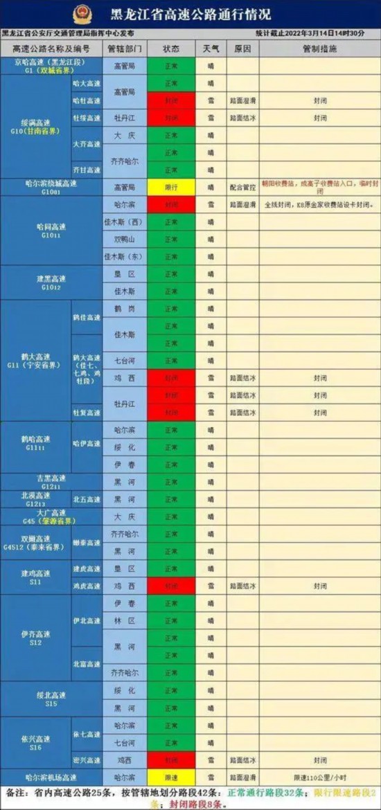荔枝新闻讯 根据黑龙江发布消息,14日14时30分,黑龙江省公安厅高速公路交通管理局对省内各高速公路的交通情况进行通报,受降雪影响,哈牡、牡绥、哈同高速(哈尔滨段)、鸡虎高速等封闭。