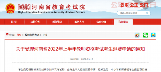 关于受理河南省2022年上半年教师资格考试考生退费申请的通知