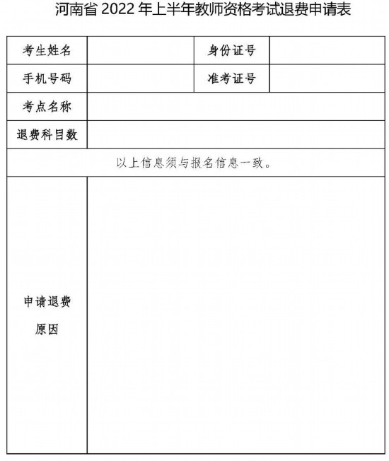 附件:河南省2022年上半年教师资格考试退费申请表