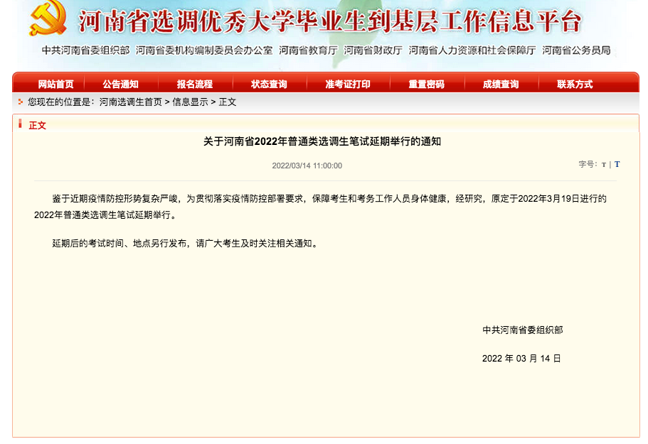 荔枝新闻讯 据“河南省选调优秀大学毕业生到基层工作信息平台”最新消息,鉴于近期疫情防控形势复杂严峻,为贯彻落实疫情防控部署要求,保障考生和考务工作人员身体健康,经研究,原定于2022年3月19日进行的2022年普通类选调生笔试延期举行。