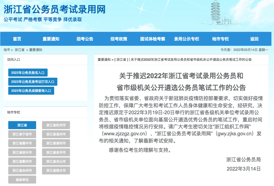 关于推迟2022年浙江省考试录用公务员和省市级机关公开遴选公务员笔试工作的公告