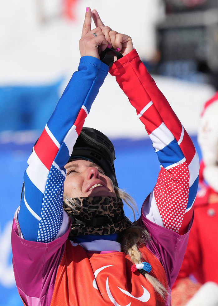 图为法国选手塞茜尔·埃尔南德斯在北京2022年冬残奥会残奥单板滑雪女子障碍追逐赛后庆祝(2022年3月7日摄)。新华社记者 万象 摄