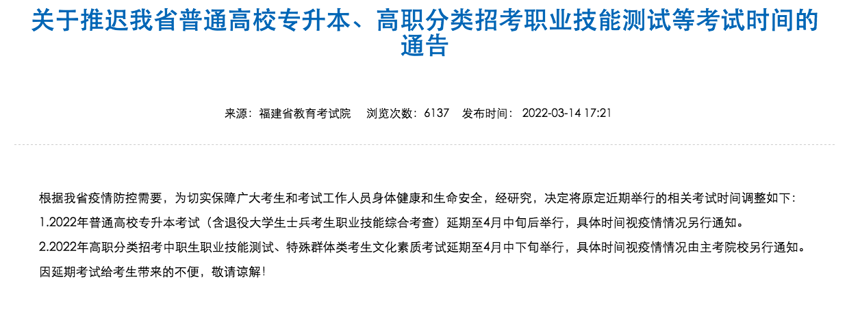 荔枝新闻讯 根据福建省教育考试院官网消息,我省疫情防控需要,为切实保障广大考生和考试工作人员身体健康和生命安全,经研究,决定将原定近期举行的相关考试时间调整如下: