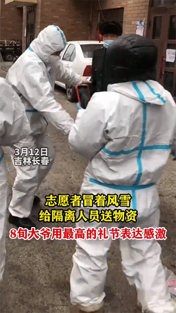 给隔离人员送物资八旬大爷深深鞠躬表达感激↓