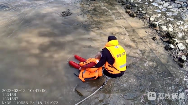 耿兵带领辅警陈俊、沈鹏、孙义驾驶巡逻艇立即赶赴现场,只见江水里一老年男子泡在水中,双手扒着身下的一块石头,浑身冻得瑟瑟发抖,嘴里喊着“救命”,随时有滑入深水区而危及生命的危险。“不要乱动,再坚持一下,我们马上下来救你”,耿兵一边安慰着落水者,一边带着救生绳,从离落水者最近的江面跳入江中,一把抓住了落水者,然后给落水者穿上救生衣,且迅速地将落水者拖离江水中施救上岸。由于落水者在水中时间较长,民警随即给落水者盖上厚厚的大衣,同时对他进行心理疏导和安慰,又用警车将落水者以最快的速度送到了南医大二附院进行检查,目前落水者生命体征已趋于平稳,已联系到亲属接回家中。