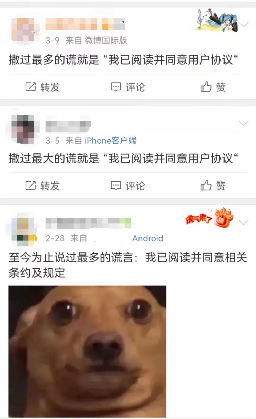 部分网民对用户协议和隐私政策的吐槽(王井怀摄)