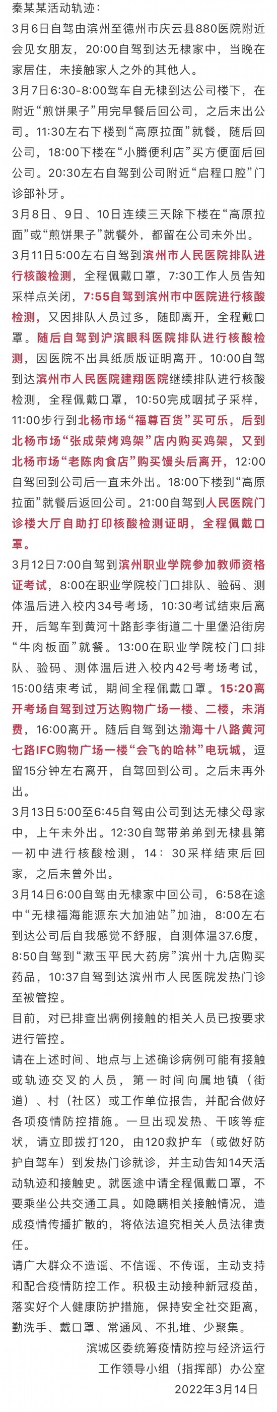 2022年3月14日18时24分,山东滨州滨城区在“愿检尽检”核酸检测中发现1例新冠肺炎检测阳性人员,经专家组会诊,诊断为新冠肺炎确诊病例。现将确诊病例秦某某的活动轨迹通告如下: