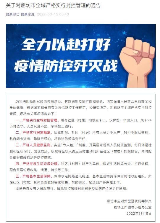 荔枝新闻讯 据河北廊坊市卫健委官方微信消息,河北廊坊市应对新型冠状病毒肺炎疫情工作领导小组办公室15日发布通知,经研究决定,对廊坊市全域严格实行封控管理,严格实行居家隔离,隔离期间,社区(村居)所有人员足不出户。