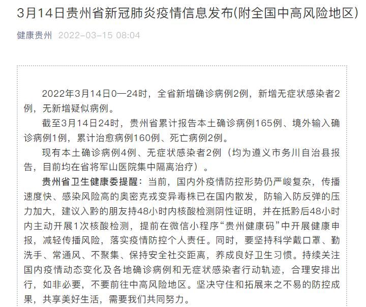 荔枝新闻讯 据健康贵州消息,2022年3月14日0—24时,贵州省新增确诊病例2例,新增无症状感染者2例,无新增疑似病例。