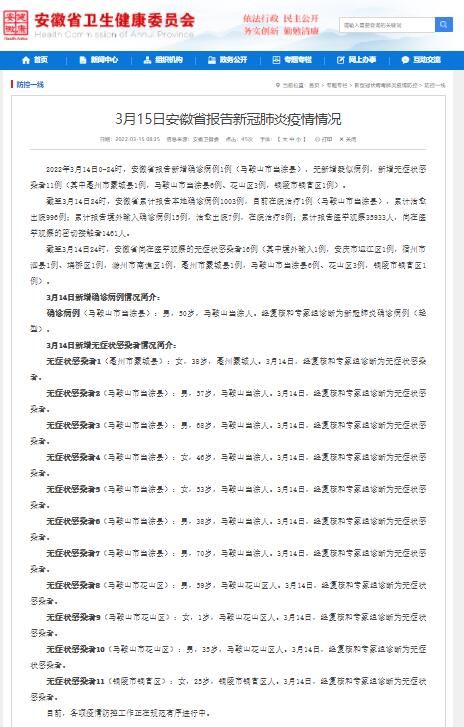 无症状感染者10(马鞍山市花山区):男,35岁,马鞍山花山区人。3月14日,经复核和专家组诊断为无症状感染者。