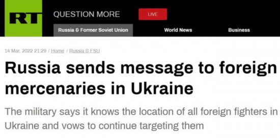 据“今日俄罗斯”(RT)14日报道,俄罗斯国防部当天向在乌克兰的外国雇佣兵发出警告,称俄方“知道在乌克兰境内的所有外国雇佣兵的位置”,对其“不会有任何仁慈”。